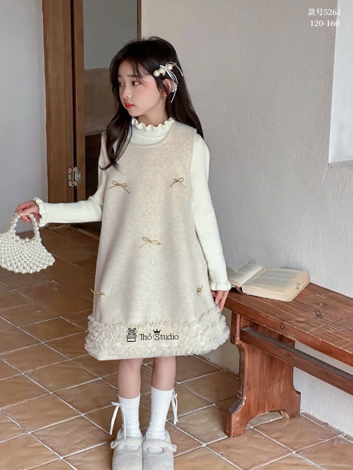 5261 - Set 2ct áo len tăm + váy dạ lót lông màu kem đính nơ bé gái size 120-160
