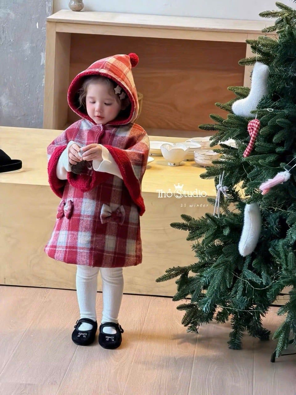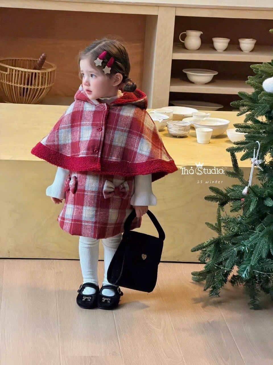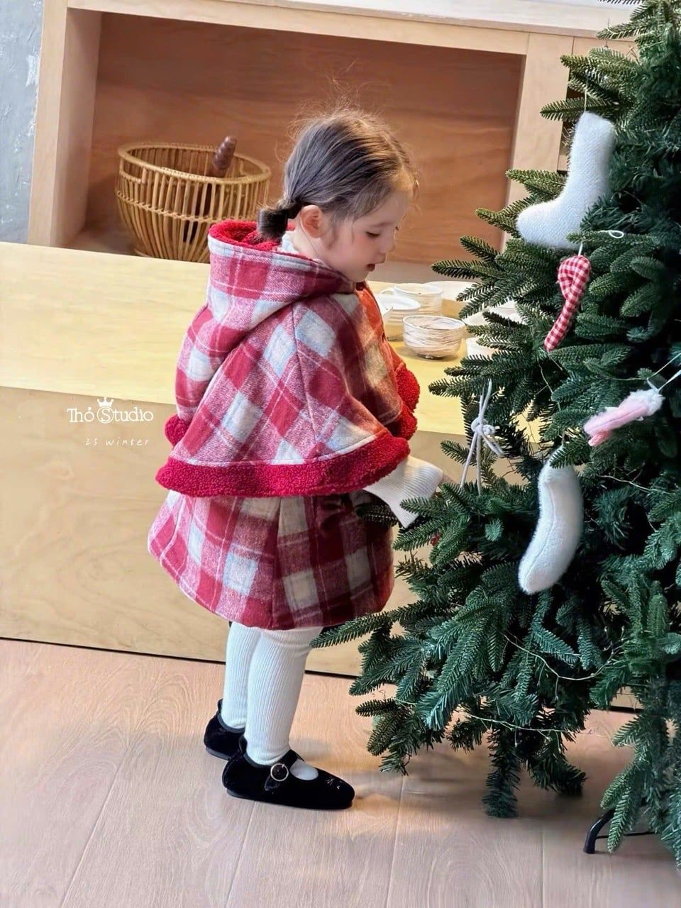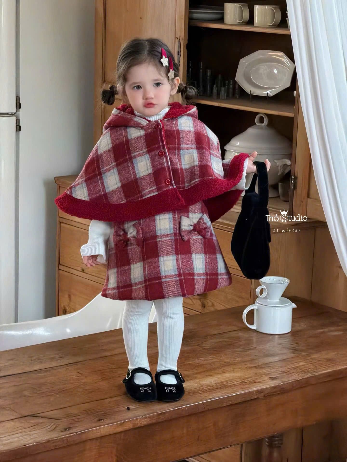 99151 - Set dạ caro đỏ áo choàng + váy cho bé size 90-130