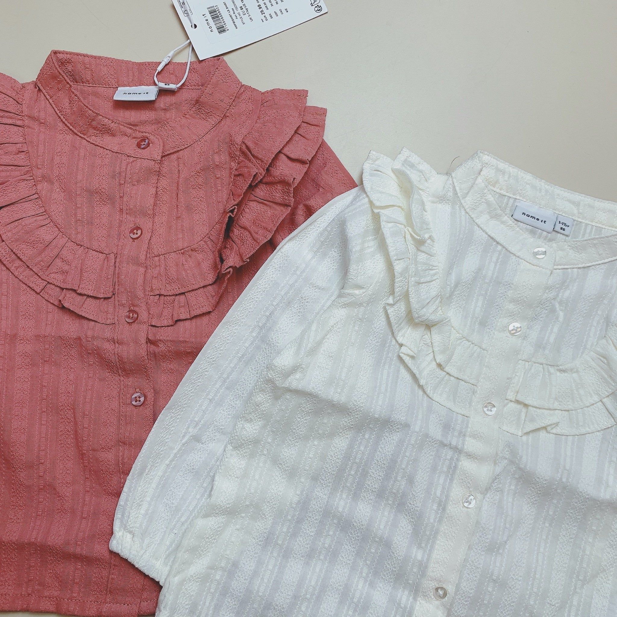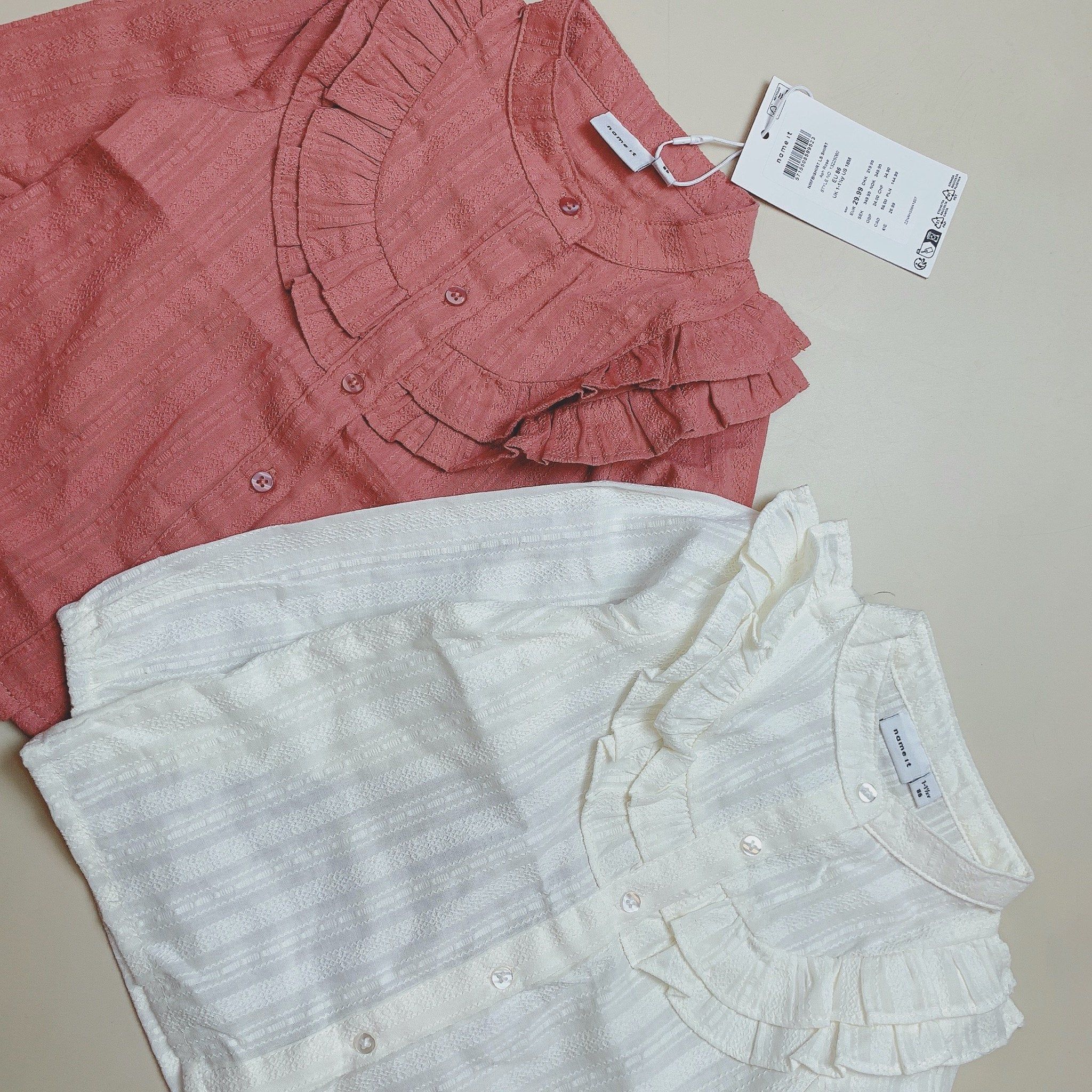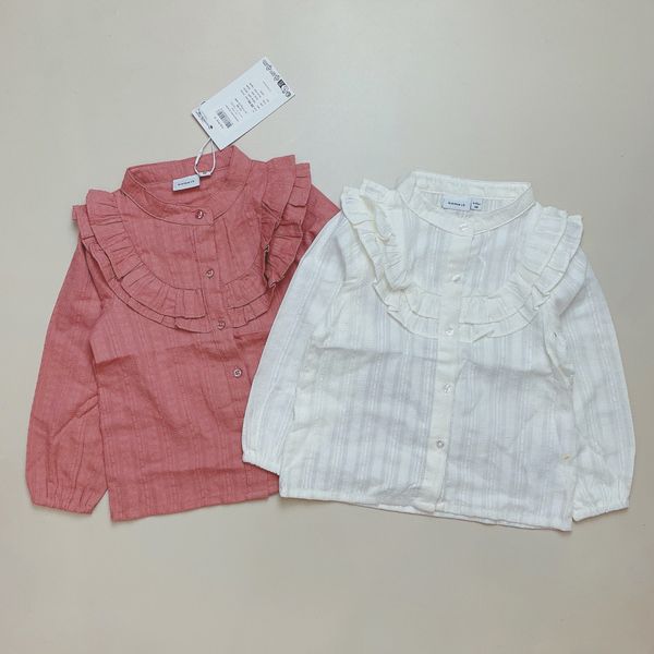 Sơ mi Name It cổ bèo cho bé gái, 2 màu trắng kem, hồng đất dễ phối đồ.