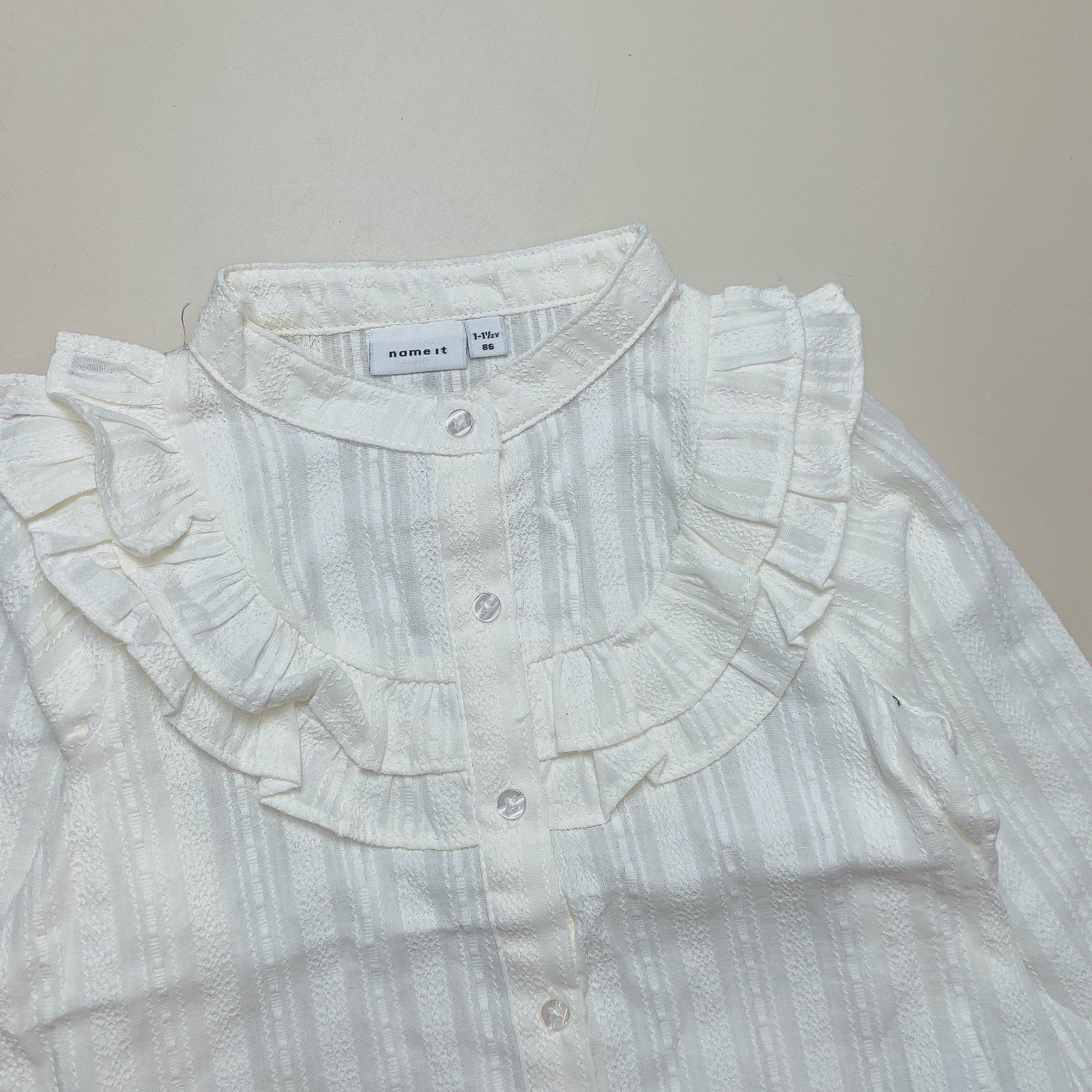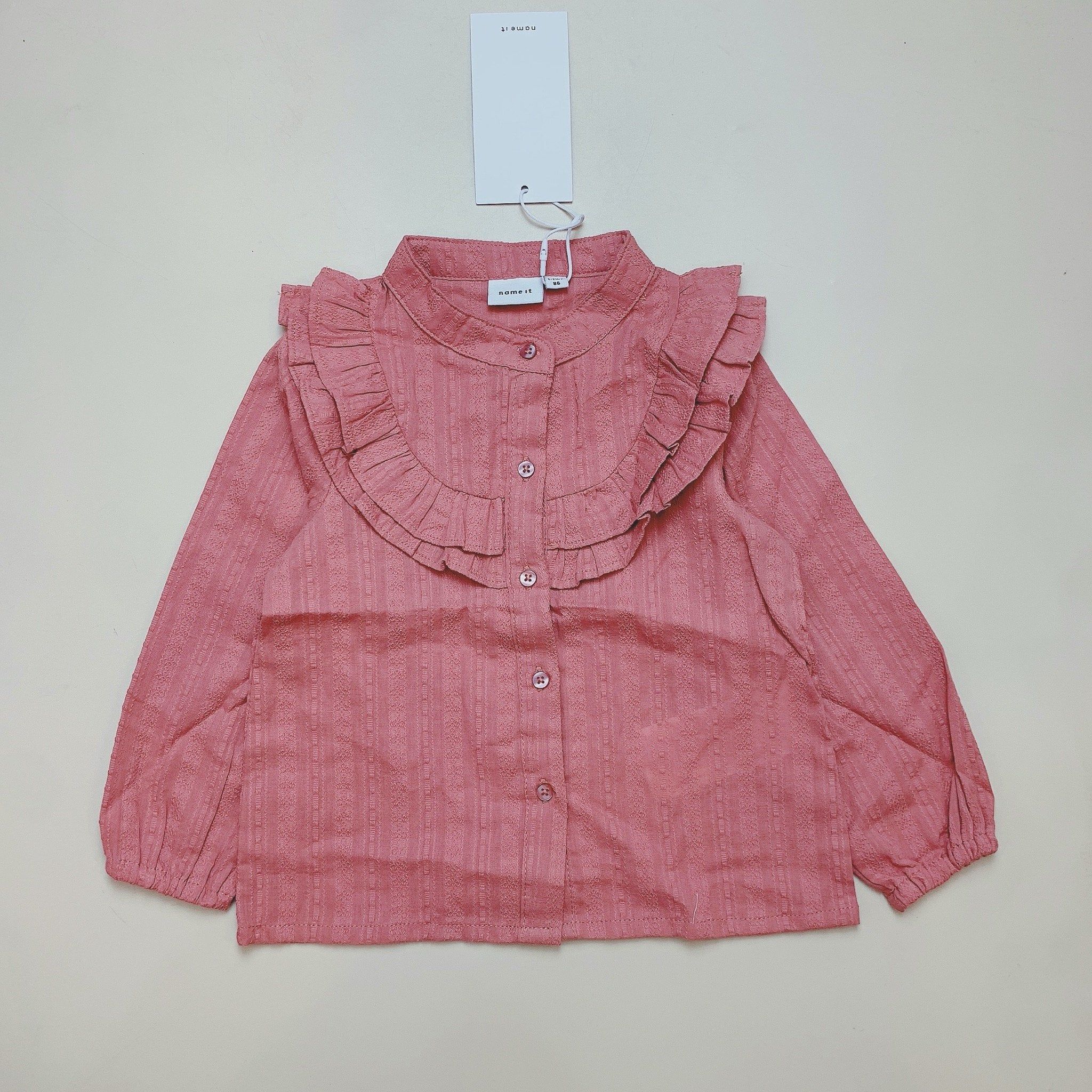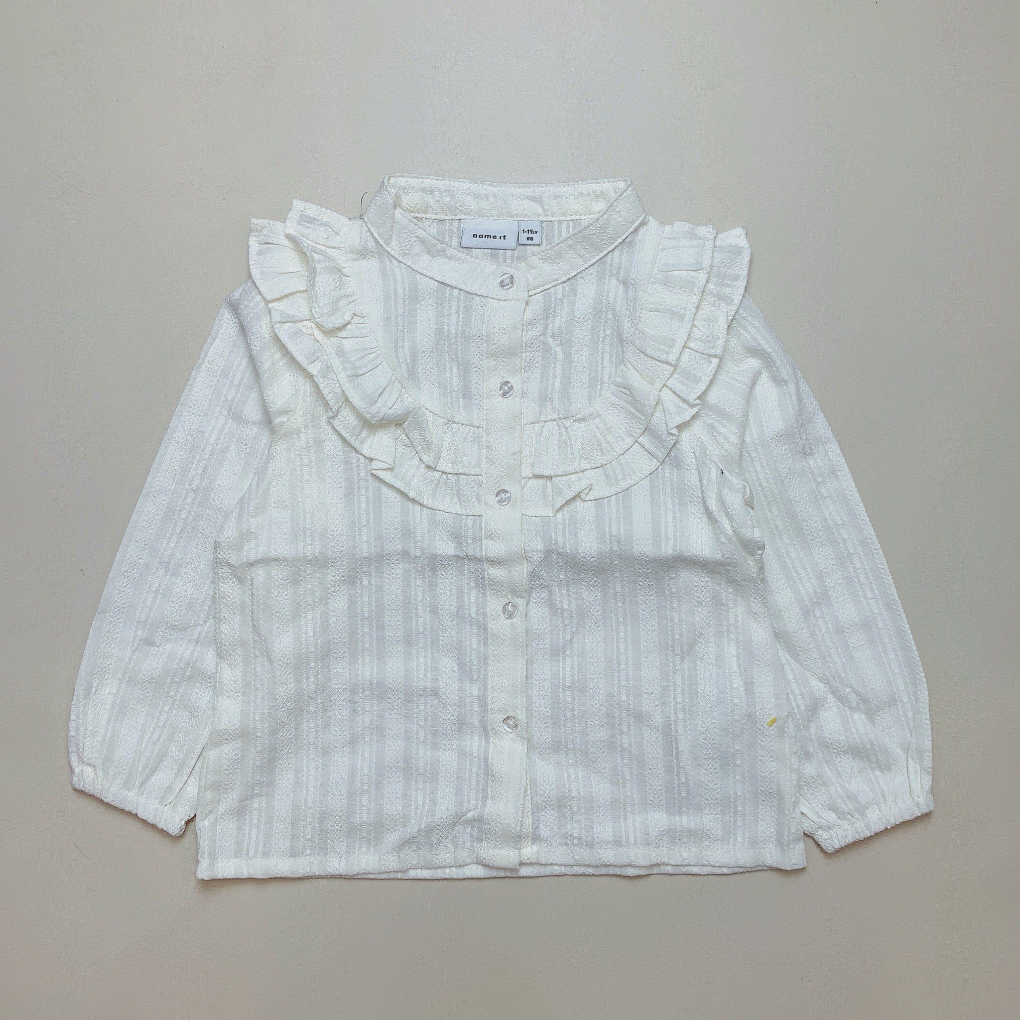 Sơ mi Name It cổ bèo cho bé gái, 2 màu trắng kem, hồng đất dễ phối đồ.
