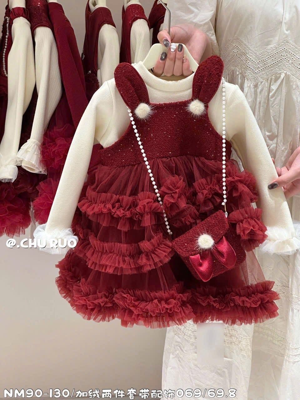 B25069 - Set 3ct áo len + váy dạ + túi 2 màu hồng/đỏ bé gái size 90-130