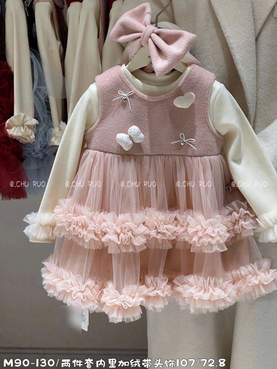 B2510 - Set áo len + váy công chúa màu hồng đính nơ bé gái size 90-130