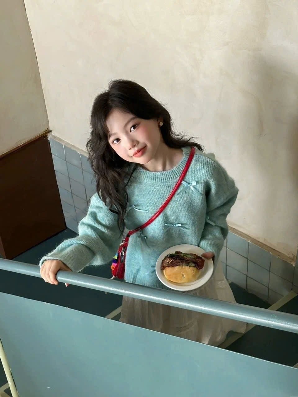 AK39 - Áo len QC Tongnono màu xanh đính nơ bé gái size 110 - 150