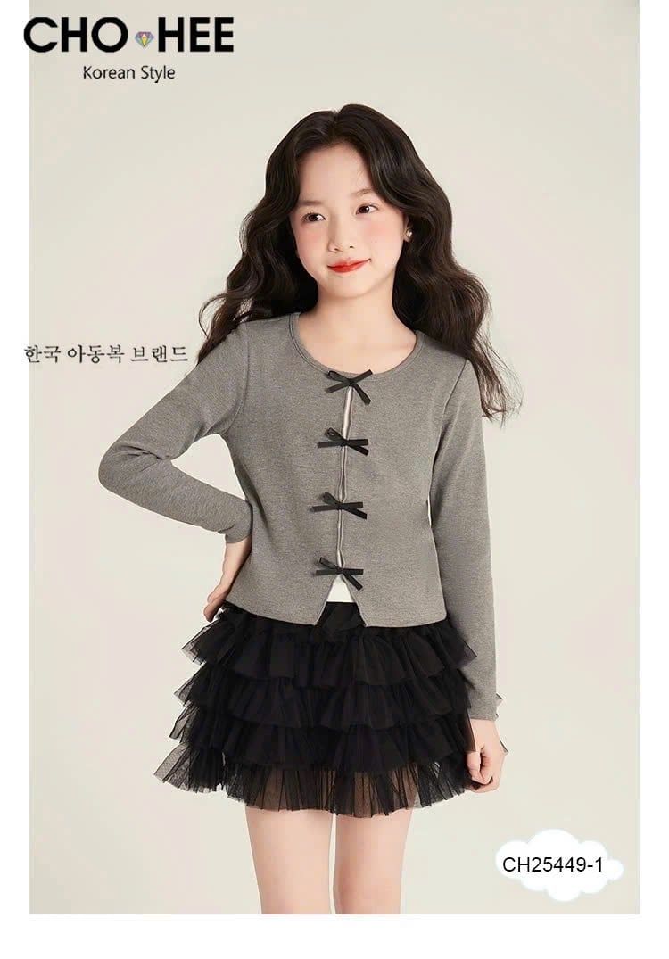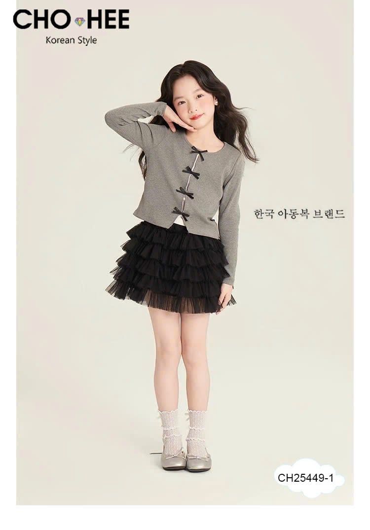 CH25449 - Bộ Cho Hee áo cotton đính nơ + chân váy tutu 2 màu bé gái size 2-11y