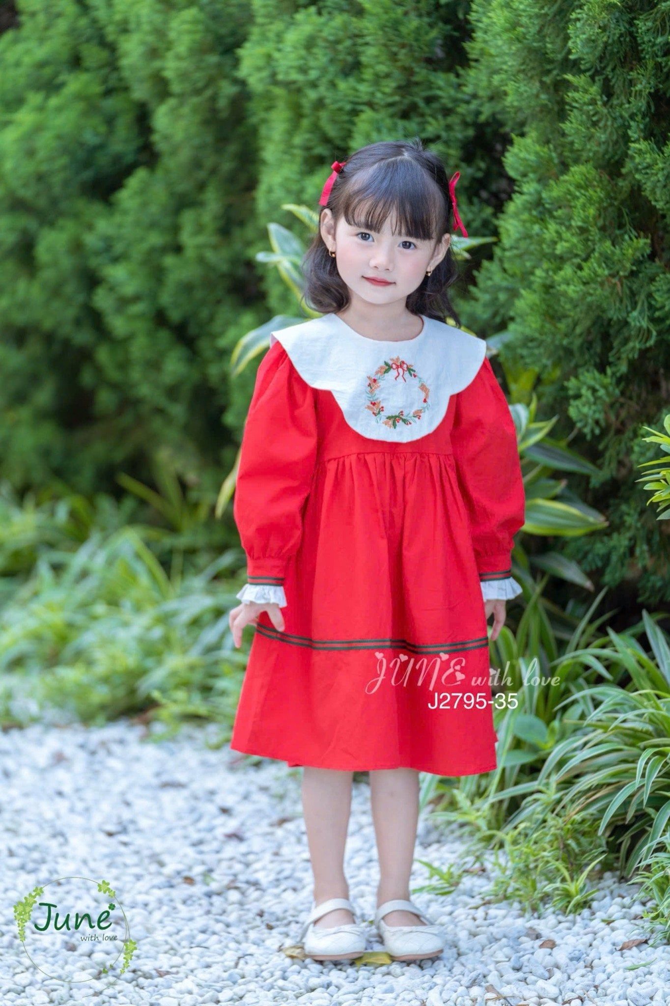 J2795 - Váy June màu đỏ cổ trắng thêu vòng nguyệt quế noel size 1-10y