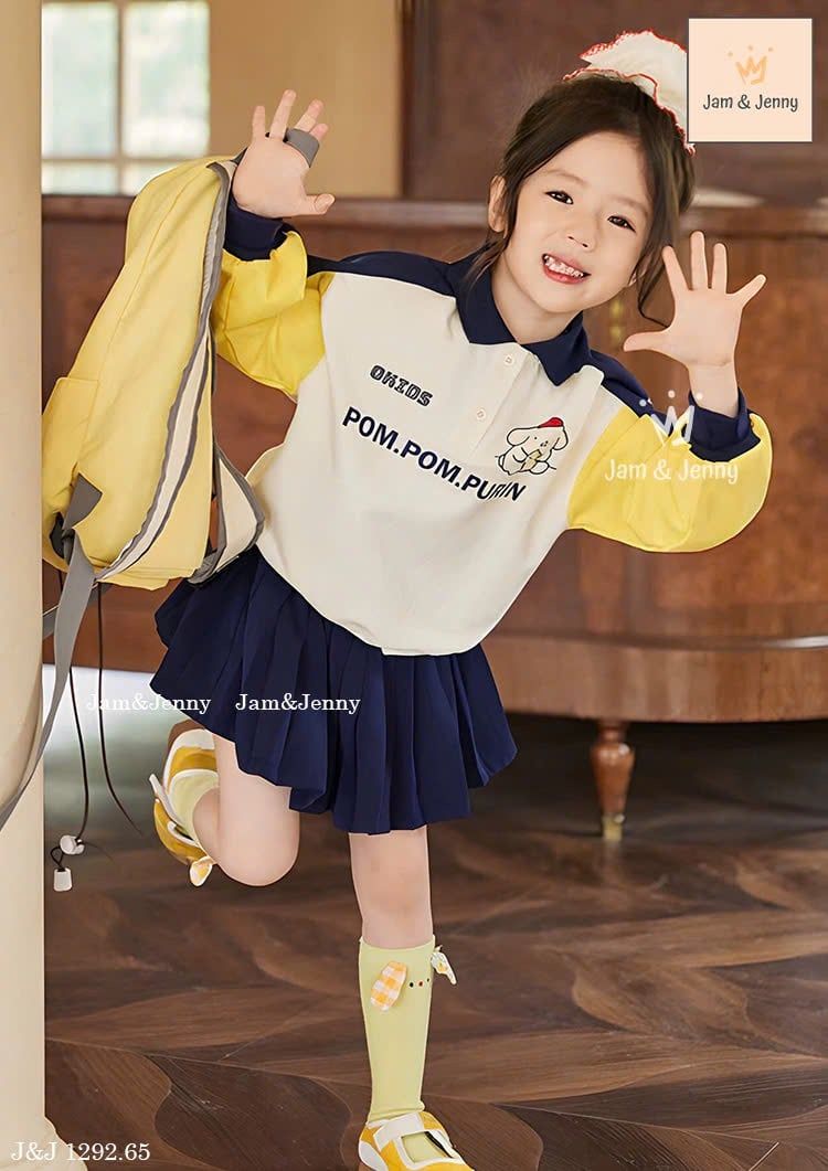 JJ 1292 - Bộ Jam & Jenny áo polo phối tay in chữ Pompompurin + chân váy size 2-12y