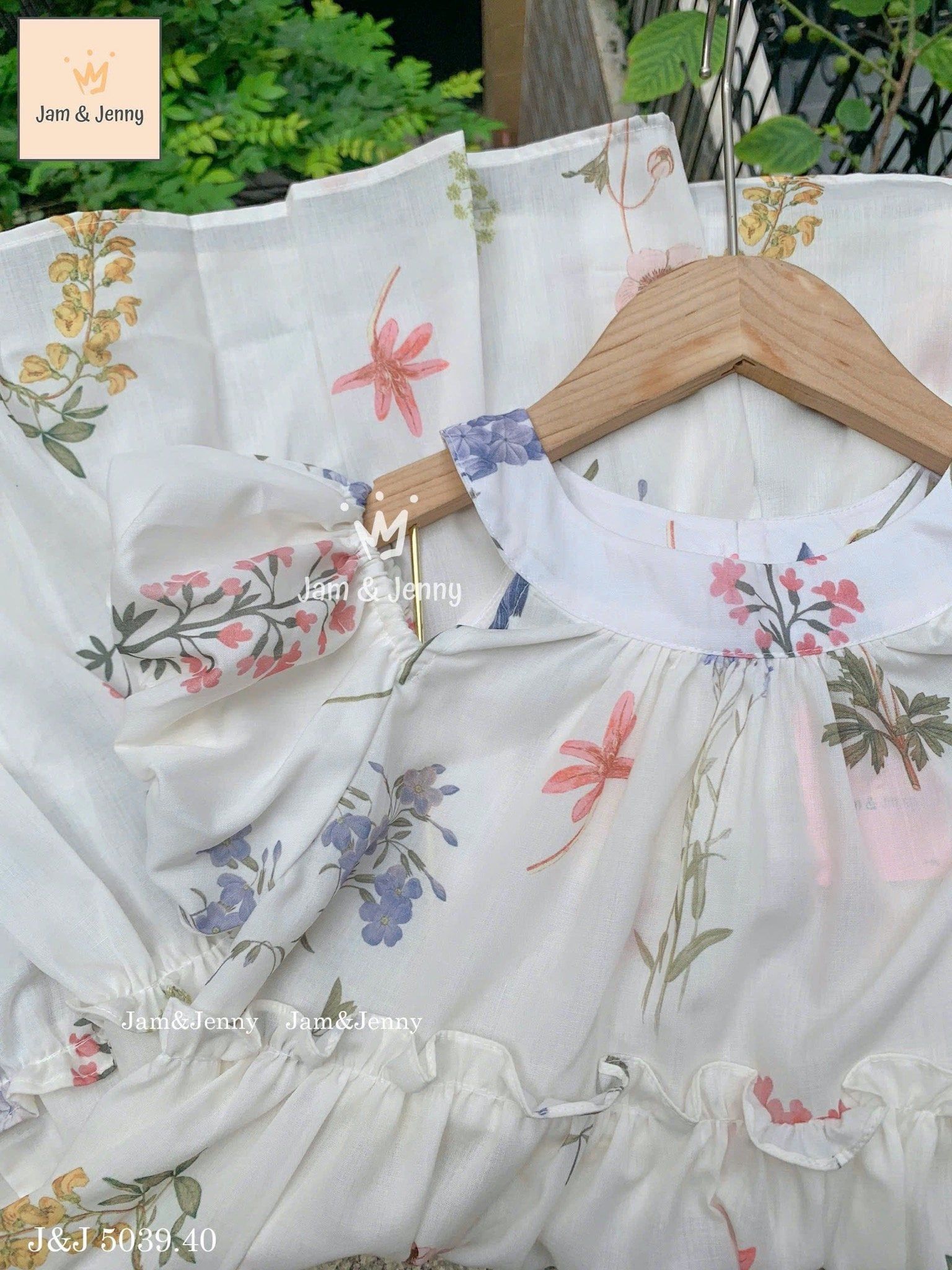 JJ 5039 - Váy vải thô Jam & Jenny cổ yếm trễ vai hoạ tiết hoa bé gái size 2-12y