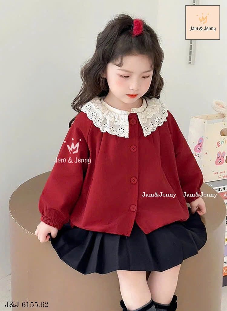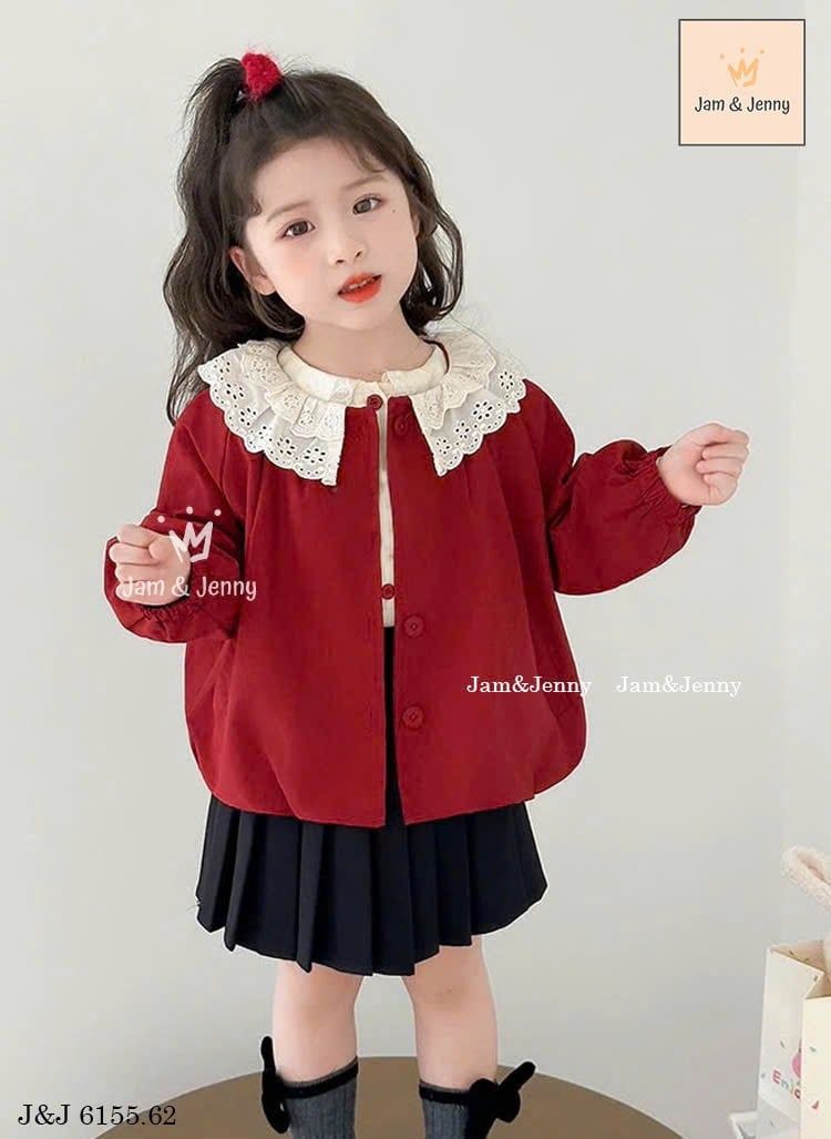 JJ 6155 - Bộ Jam & Jenny áo khoác gió đỏ cổ ren trắng + chân váy xếp ly đen size 2-12y