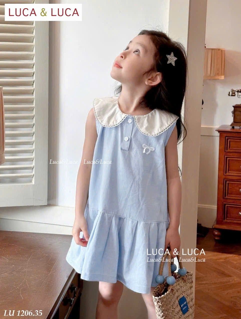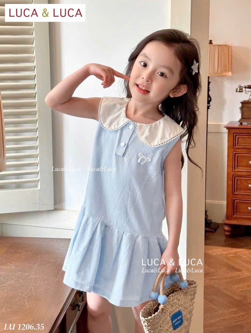 LU 1206 - Váy Luca sát nách cổ sen trắng thêu nơ ngực 2 màu hồng/xanh bé gái size 2-12y