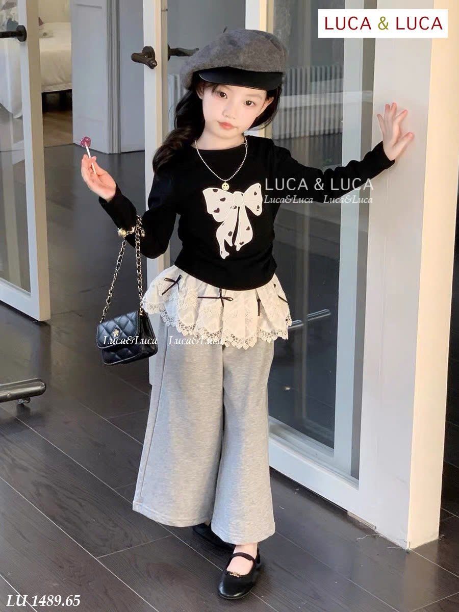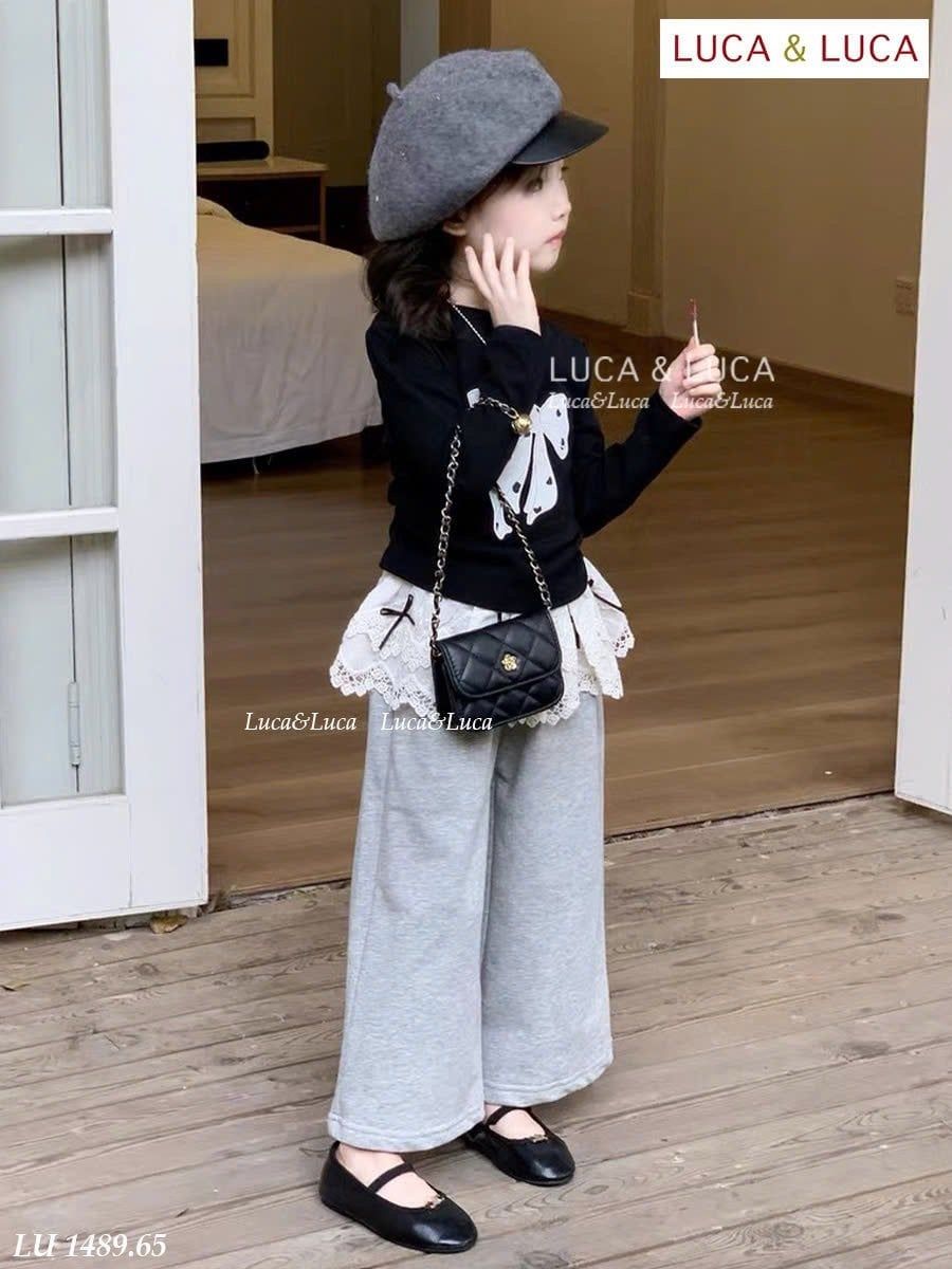 LU 1489 - Set bộ Luca áo nơ đen + quần ghi ống suông bé gái size 2-12y