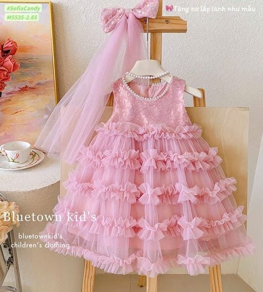 M5535 - Váy công chúa kim sa Mia Kids màu hồng tặng nơ cài tóc bé gái size 1-10y
