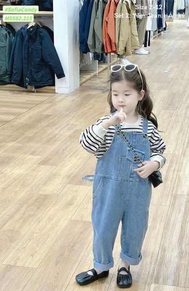M5582 - Set Mia Kids áo thun kẻ trắng đen - quần yếm jean xanh size 2 - 12y