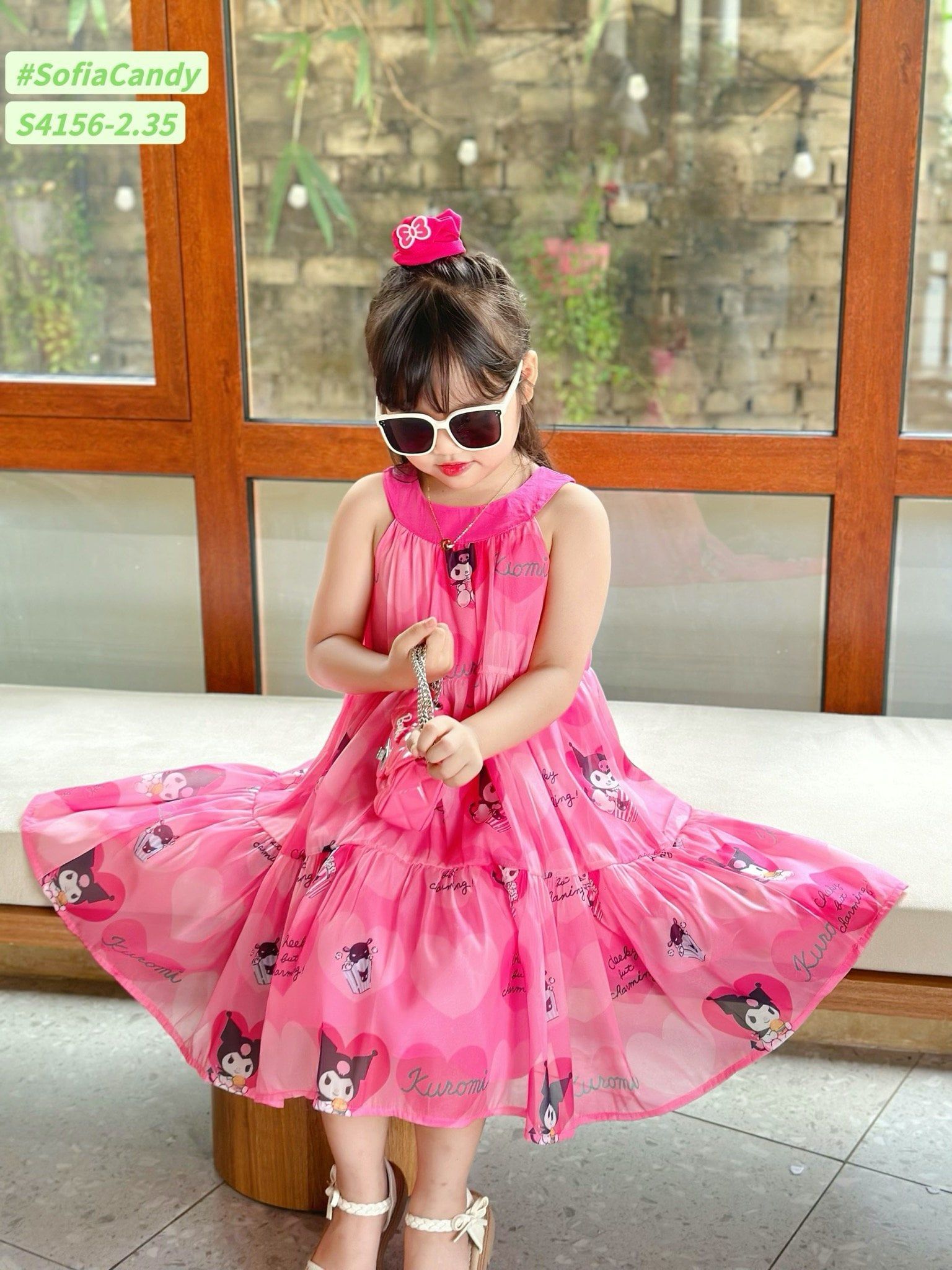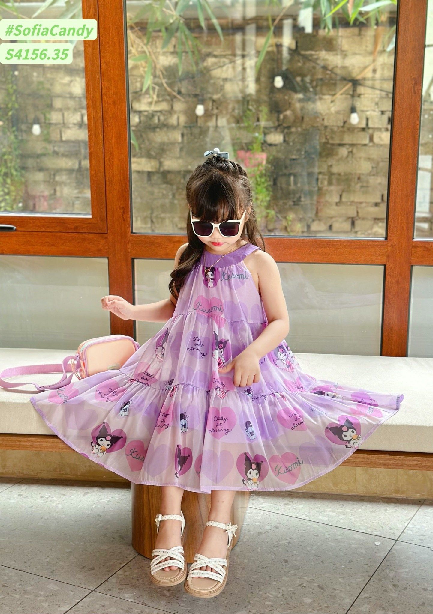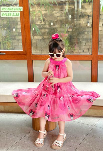 S4156 - Váy Sofia Candy vải tơ kuromi 2 màu hồng/tím in tràn cổ yếm size 1-10y