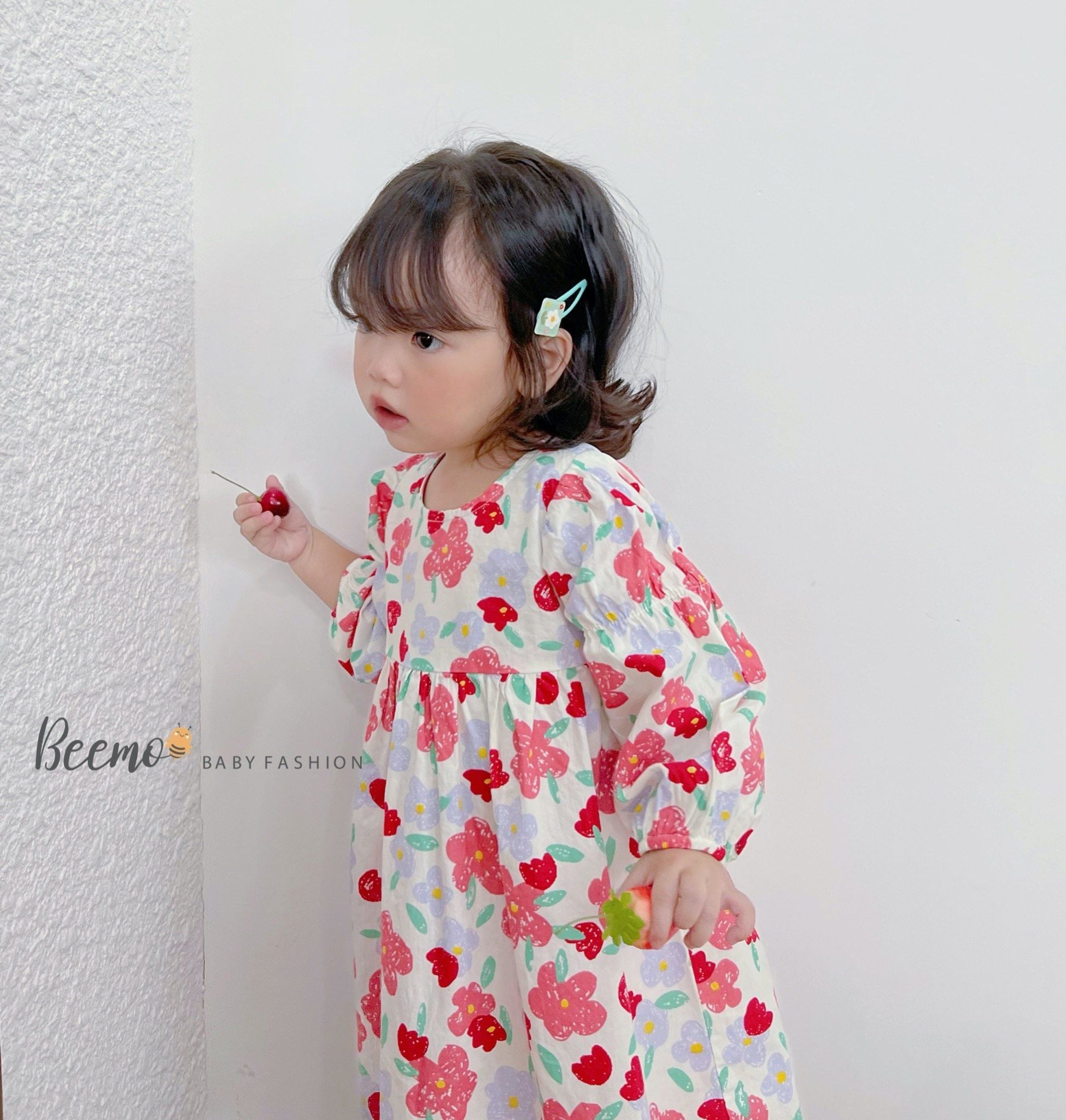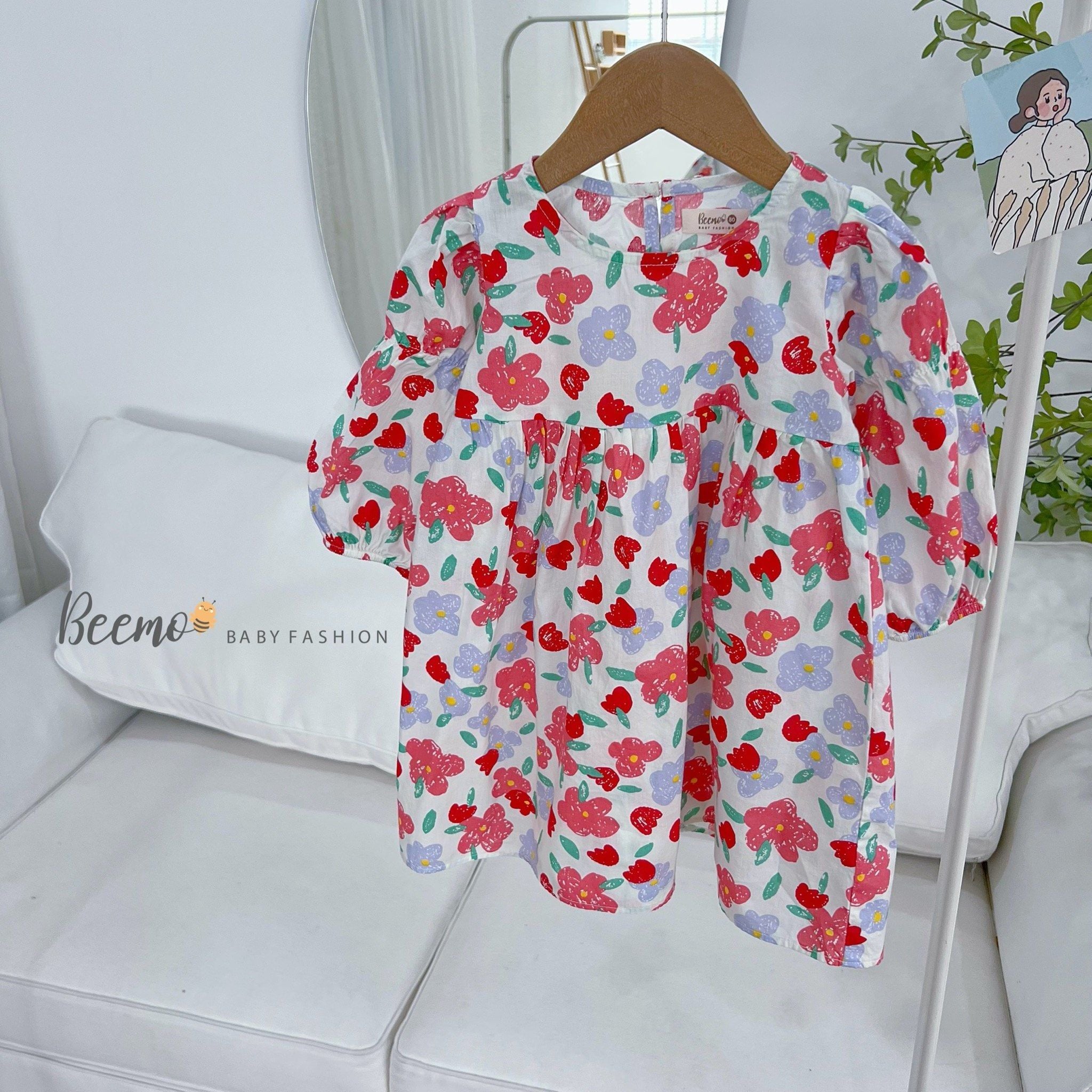 V00126 - Váy hoa nhí tay nhún Beemo 2 màu xanh/đỏ BG