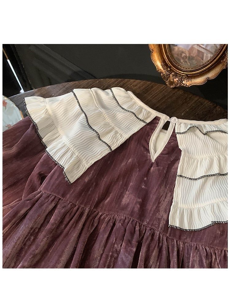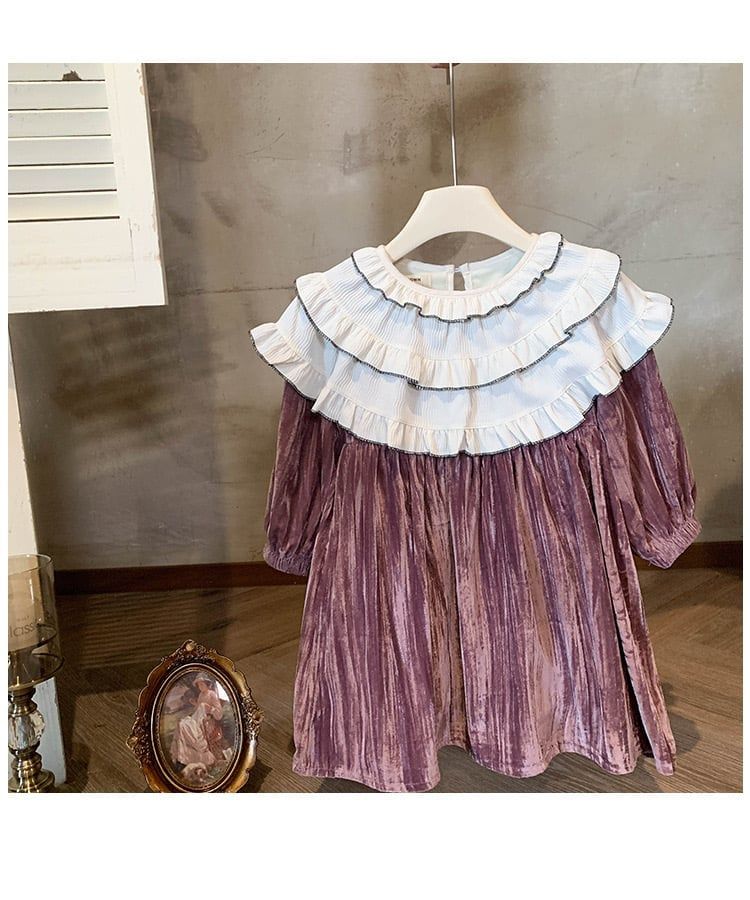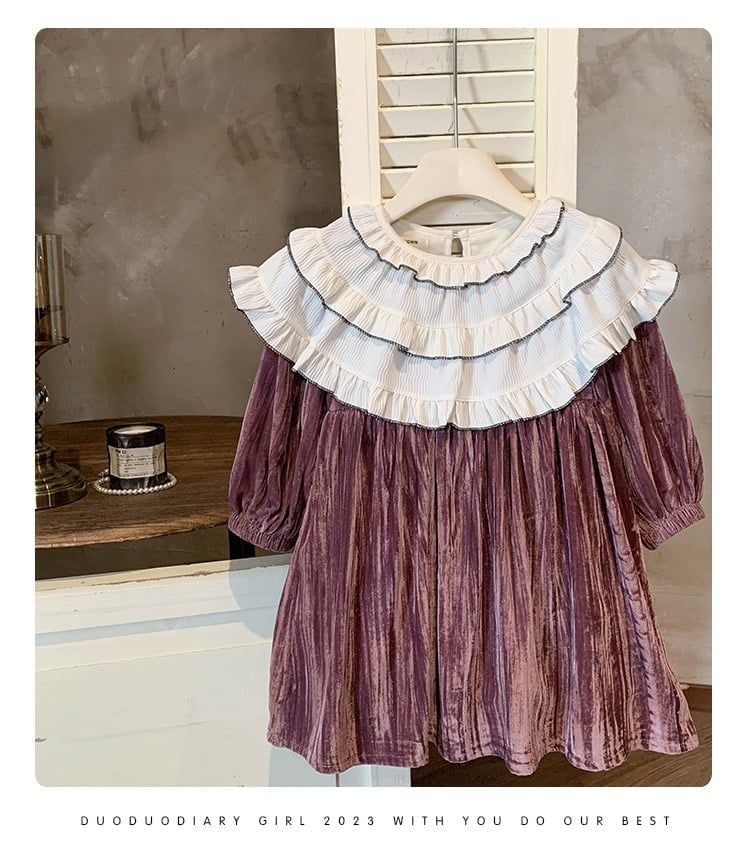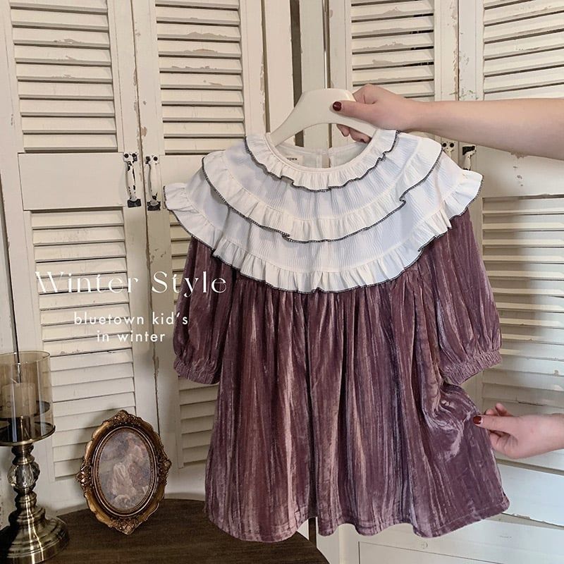 V00112 - Váy nhung lót nỉ màu hồng nâu cổ bèo trắng bé gái size 90-140