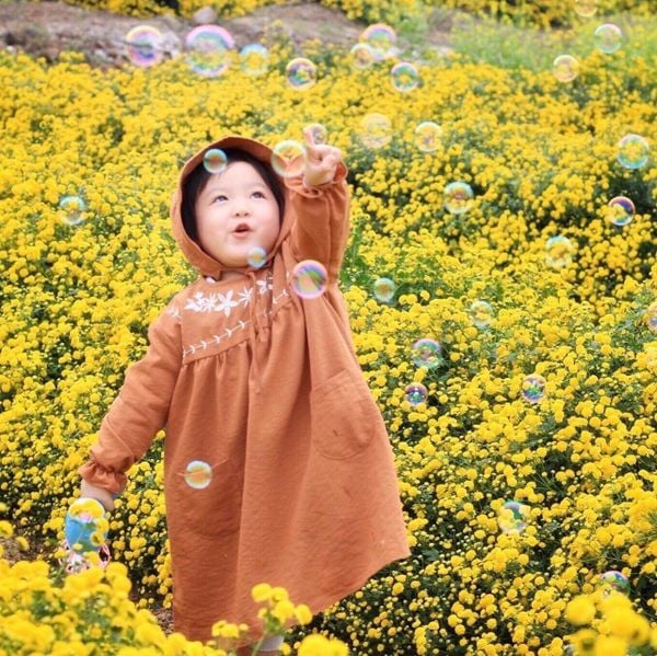 Váy thô Kaii màu nâu dài tay thêu hoa ngực bé gái